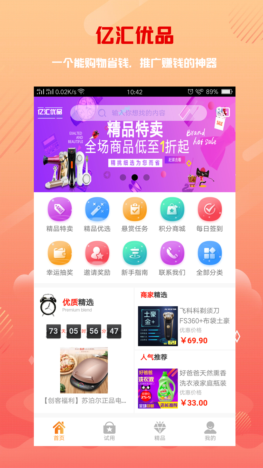 亿汇优品app是一家专注于为淘宝、天猫、京东、苏宁易购、唯品会等各大商城做商品免费试用,是个特价折扣的服务平台,内急海量优质免费商品,折扣特价商品。汇聚亿万优质商品,为您所省!