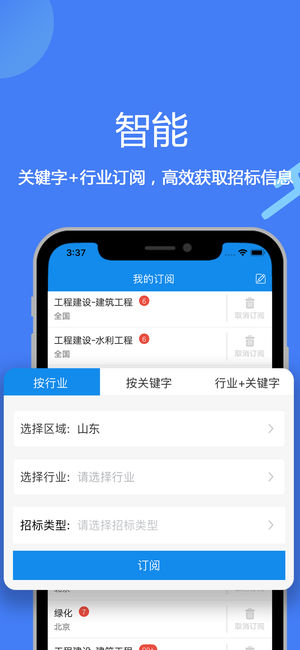 运用人工智能技术,可按行业、按关键字、按行业+加关键字订阅所需的招标信息,相关招标信息一旦发布,立即推送,再也不用担心错过招标信息了。