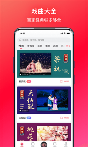 戏多多app集合了数万个经典戏曲的视频资源,从名家名段到小众演绎应有尽有。用户可以通过分类查找、搜索关键词等方式轻松找到自己喜欢的戏曲资源。同时,它还支持音频、视频等不同表现形式的戏曲资源在线播放和下载,让用户随时随地都能享受戏曲的魅力。
