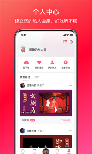4. 个人中心:用户可以建立私人曲库,收藏喜欢的戏曲资源,并查看自己的观看历史和下载的戏曲信息。