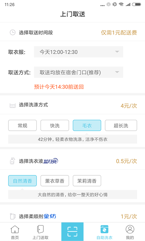 选择洗涤方式、洗衣液、柔顺济、实现预约洗衣、自由选择洗衣配送时间、在线支付,并实时掌控洗衣动态。