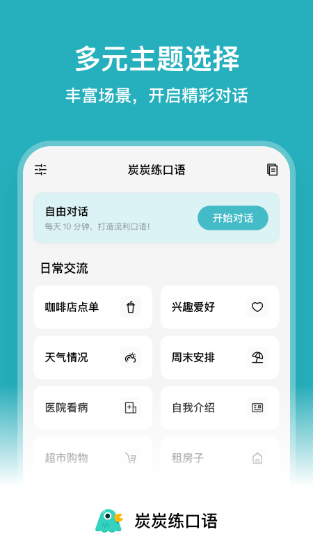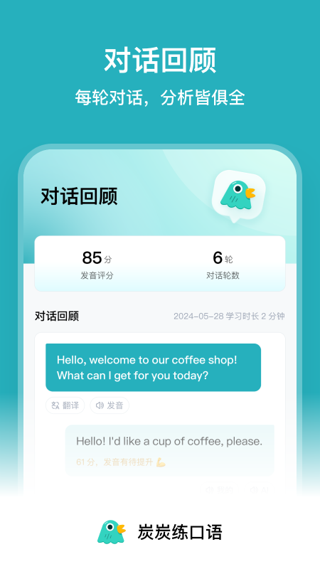 炭炭练口语APP通过模拟真实对话场景、提供即时语音反馈、智能评估发音准确度等功能,为用户创造了一个沉浸式的英语口语学习环境。用户可以通过与虚拟角色的对话、完成各种口语任务来锻炼口语能力,并随时查看自己的学习进度和成绩。