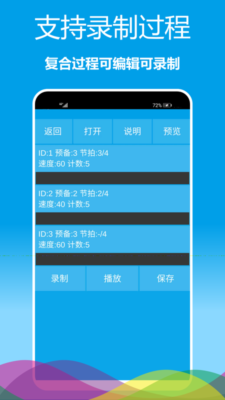 2. 录音功能:支持录音功能,用户可以录制自己的演奏并与节拍器进行对比,找出节奏上的问题。