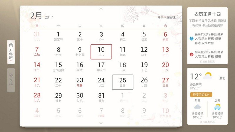 1. 日历查询:用户可通过万年历TV版查询任意日期的公历、农历信息,包括星期、节气、节日等。