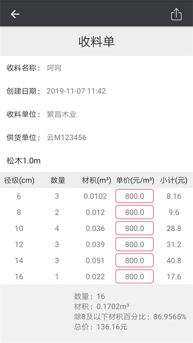4. 计算并保存结果:点击计算按钮,应用将自动计算出材积结果,并支持用户保存记录。