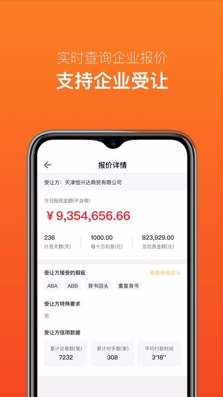 头号秒贴app是一款票据交易更便捷的服务平台,可帮助用可以更便捷的进行票据交易,节约更多的交易时间,简单更便捷。我们有效集银行、企业等多个金融机构和融资方,精心为众多持票人提供快速出票的融资服务。app实时为用户提供精准报价服务,用户打开应用就能详细了解报价的信息,以便用户可以选择性进行交易。交易的金额可以极速到账,安全高效,用户不用过多的操作,提现更加的简单化。头号秒贴app可以自动识别票面信息,用户不用手动录入,即可精准分析。用户可以随时在线查询银行的报价信息,没有任何限制。