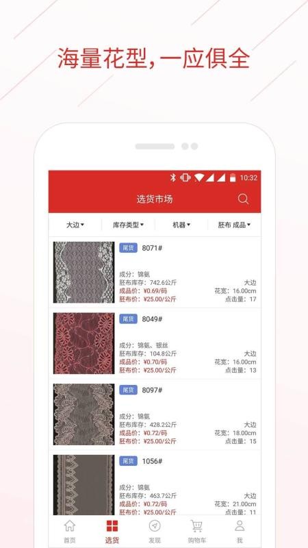 辅布司app是一款好用的手机购物软件,这款软件拥有非常多的布料,各种材质各种花色的都有,平台商品质量也是没话说,你可以在这里以更低的价格购买,欢迎各位有需要的朋友们下载使用这款软件。让有需要的批发商与供应商可以迅速完成买卖,致力于推动蕾丝制造行业的买卖发展趋势;服务平台聚集很多货运信息,这里用户能够寻找不同花纹、色调、规格型号的蕾丝一手货源,无论你对蕾丝商品有一切要求都能轻轻松松寻找合适的一手货源,另外系统软件显示信息制成品价与胚布价供你挑选一手货源种类,如果令人满意则立即放进加入购物车购买,助你迅速完成一手货源买卖。