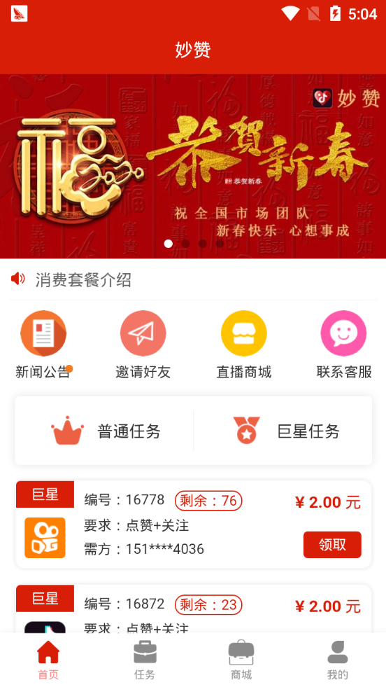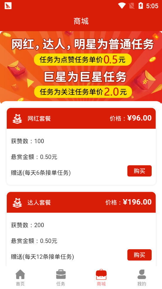 网红:每日任务数4条(加2条赠送任务)任务单价0.5元;