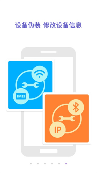 2. 设备伪装:能够修改硬件IMEI设备ID、WIFI硬件地址、蓝牙硬件地址、IP地址等,让用户在社交软件中伪装成其他设备。