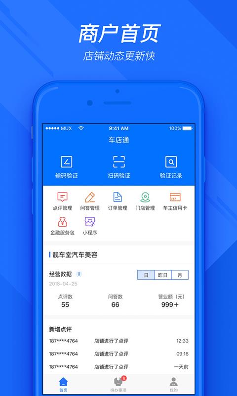车店通app是一款面向广大汽配维修商提供的后台管理系统,能够帮助商家轻松的知晓客户需求意见,同时也能够更好的管理门店,提高自己门店的服务质量意见宣传工作。商家可回应用户评价、查看经营数据、处理线上订单。只要手机号就可便捷注册,提交营业资质证明就可拥有使用权限。app实时更新和接受客户发布的点评评价,最新的订单信息都会自动保存下来,随时随地都能进入查看,还能直接通过app与客户进行互动,全面满足客户需求,实时的跟进客户,提高服务质量;同时门店每天的订单情况以及门店经营效率都会生成报表,帮助你更直观的了解门店经营情况,全面改善服务模式以及经营理念,结合实际情况提高门店接单获客量。