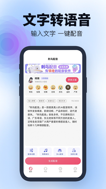 1. 多语音选择:刺鸟配音提供了多种语音包,包括男声、女声、童声等多种音色,用户可以根据内容选择最适合的语音。