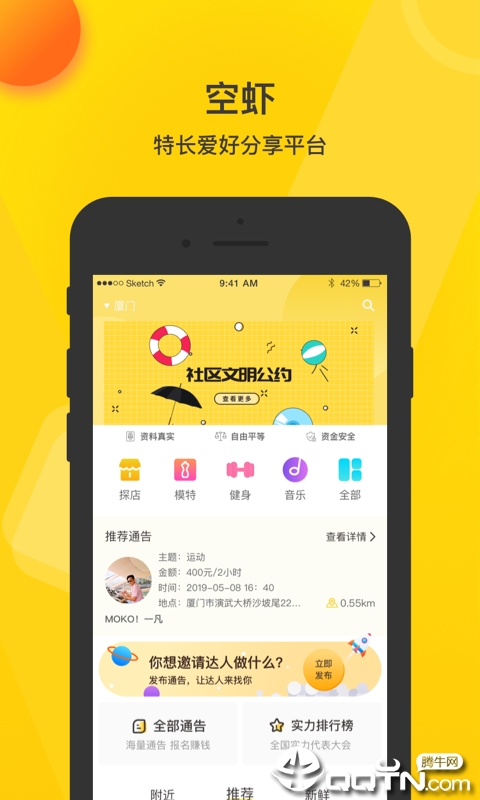 空虾是一款爱好特长分享app,使用空虾app在双方认同彼此价值的情况下,可以自由平等地交易,在空虾app这里你可以邀请他人如咨询、运动、摄影、商演、主持和表演等合法活动。空虾app,在这里大家可以分享自己的特长,给更多人以帮助;你的兴趣将在这里继续发光发热,并结交志同道合的人,一起学习一起进步哦!