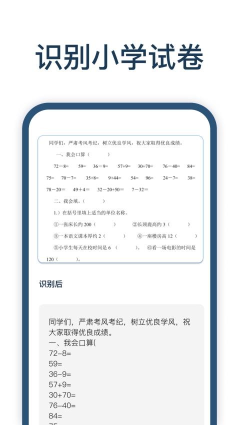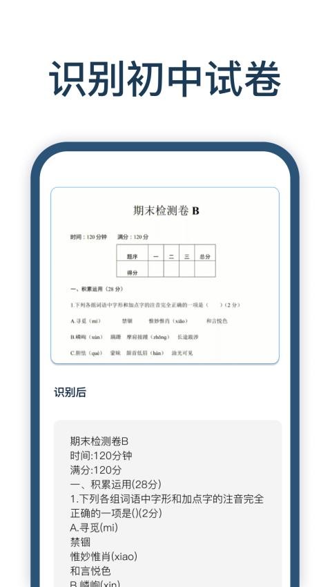 1. 高效试卷识别:采用先进的 OCR(光学字符识别)技术,能够快速、准确地识别试卷上的文字内容,无论是印刷体还是较为清晰的手写体,都能精准识别,大大节省了手动输入的时间和精力。