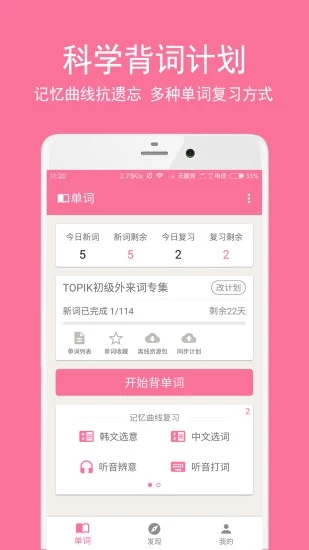 卡卡韩语app已经上线了,用户可以看到每天的背词计划内容,还有智能单词系统从词义读法等多方面来教学,汉语词库的内容非常的丰富,你还可以通过一些综艺电视剧的片段来巩固自己学习的知识,需要的小伙伴们快来下载卡卡韩语软件体验一下试试吧。