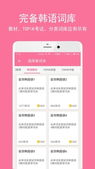 延世韩国语教材、TOPIK考试初级、中级、高级、以及各种分类词库,应有尽有。