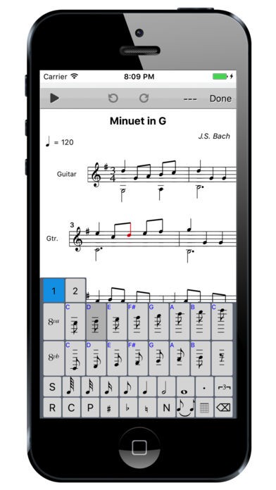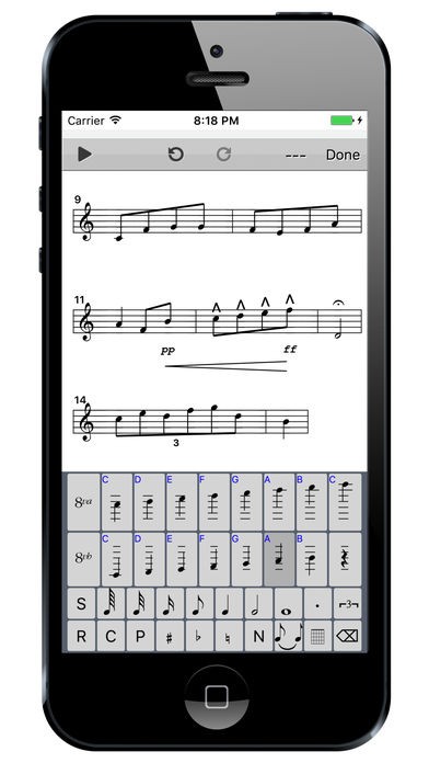 采用类似文字输入的虚拟键盘设计,用户可直接点击音符/和弦符号(如C大调、G和弦),无需缩放或拖拽屏幕。例如,输入一段钢琴旋律时,仅需连续点击键盘即可生成五线谱。