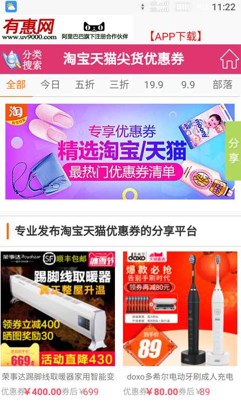天猫五折券app是一个为发布淘宝网、天猫优惠券的服务平台,天猫五折券app每天更新和发布的淘宝天猫商家的活动优惠券超过6000条,有五折优惠券、三折优惠券、19块9包邮、9块9包邮等,商品折扣率绝大部分都超过五折,甚至一折。让您得到更高的打折幅度,那样购物才会变得十分的划算;每日都是有店家在这里发布各种各样购物主题活动信息内容,并且还会继续大批量的发布优惠券,您都能够在服务平台迅速的查询;丰富多彩多样的购物主题活动,肯定能够让用户目不暇接,之后购物就能有着大量的挑选了。