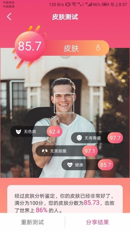 智能人脸测试app是一款拥有多种趣味测试功能的软件。智能人脸测试app可以测试你的颜值分数,除此之外智能人脸测试app还能测皮肤以及财运等多种有趣的趣味测试,非常好玩!它还能够在各种各样情景下使用,为你检测出详尽精确的面部分析结果;你能用它来认识自己皮肤是不是身心健康,而且系统软件会全自动根据你的青春痘、黑眼圈眼袋以及色素斑等层面,各个方面多层次的为你分析当今皮肤情况;智能化面部检测app有着颜值测试作用,根据强劲的人工智能技术以及数据分析,而且根据你的双眼、嘴唇、脸形五官测算你的颜值评分。