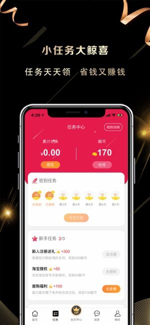 淘小鲸app是一款大家可以拥有超级高额度的返利的购物商城平台哦。线上的商品类型很丰富,大家可以很好的线上购物选择你喜欢的各种商品。不论大家想要购买什么这里都能很快的找到。这里一站式的购物体验也是极好的。软件功能非常强大,里面汇集了海量种类的商品,质量优质,价格实惠,还有大量的优惠券发放,用户领取优惠券在购物超级划算,线上大家也是能够第一时间直接查看找自己喜欢的各种任务。更多高端任务你不要错过。有需要的朋友快下载体验吧!