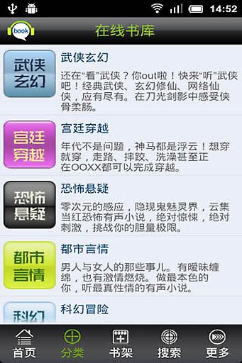 不坑爹,不伤娘,‘盛大听书’让你轻松享受听书乐趣!你只需准备好自己的耳朵,便可开始一次奇妙的听书之旅。历史故事、幽默笑话、少儿读物、百家讲坛、玄幻小说、武侠小说、美女言情、唐宋诗词、当代文学、古典文学、经典名著、职场励志、理财投资、健康养生、家庭教育、军事战争、宫廷穿越、恐怖悬疑、广播剧等等,精品有声读物应有尽有,300000篇有声读物让你免费畅听