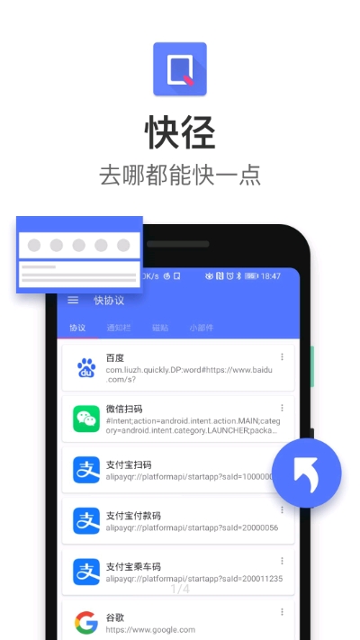 这款软件和很多自动化软件有着异曲同工之妙,但其实在软件的功能上面这款软件更加的接近于苹果的捷径!只要有应用定义的协议,依据该应用的协议规则,就都能打开。能够方便用户查找自己需要的手机APP,不管做什么都能快人一步,功能齐全,这款自动化的软件能够为你实现许多功能,衣食住行、吃喝玩乐、聊天交友一站式搞定。而且用户可以使用快径app更好的进行各种便捷桌面服务。快来下载吧!