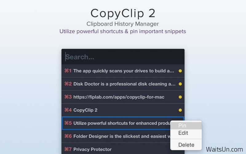 - Pinning items to the top of the list keeps those important clippings within easy reach
