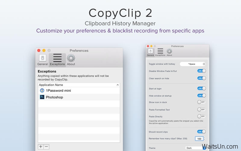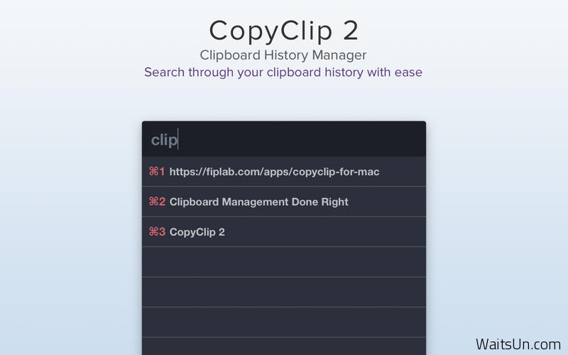 CopyClip 2 is the slickest and most efficient premium clipboard manager for your Mac. Running discreetly from your menu bar, the app stores all that you have copied or cut in the past, allowing you to quickly find that snippet of text you've been looking for.