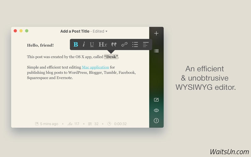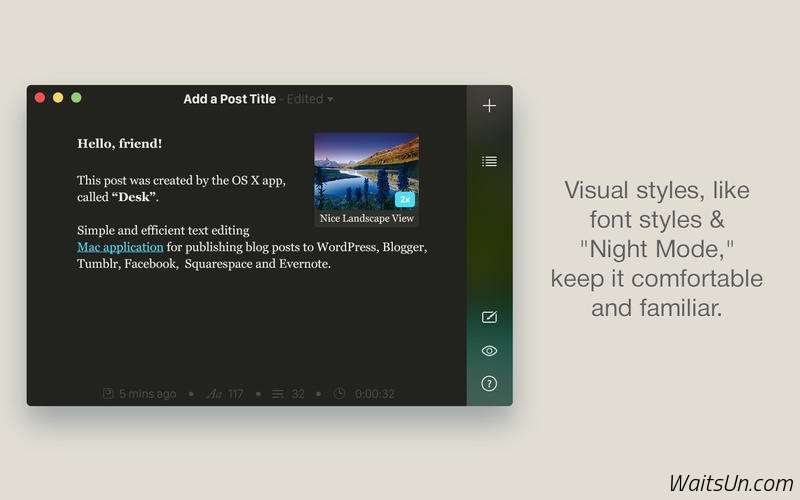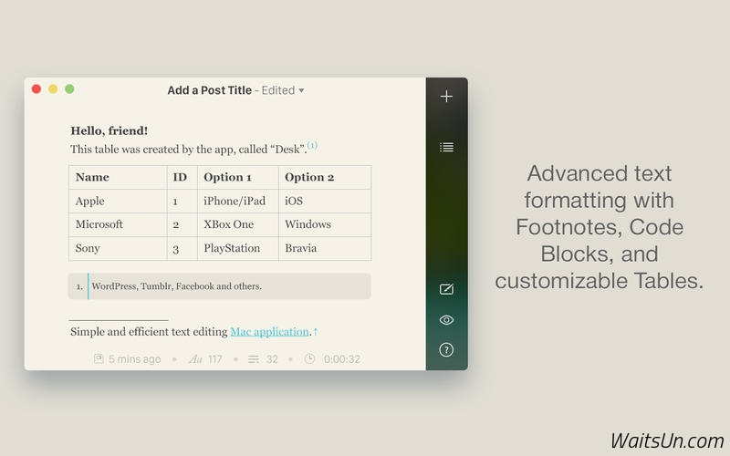 Desk NT 是一款Mac上优秀的文本写作工具,简单易用,专注于写作,支持导出为HTML, RTF, PDF, DOCX, TXT, MD!