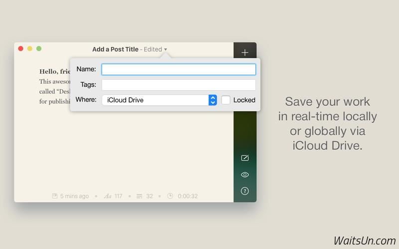 - Automatic backups (Autosave) while you write (iCloud and Offline)