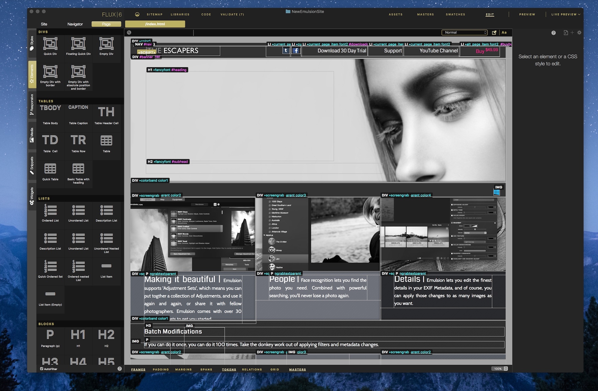 Flux has an amazing WYSIWYG engine (What You See Is What You Get). In Flux, you don't need to code everything, or even anything, you can drag images onto your page, adjust sizes with the drag handles, even adjust CSS properties such as margins and padding. You can even adjust external CSS properties this way.