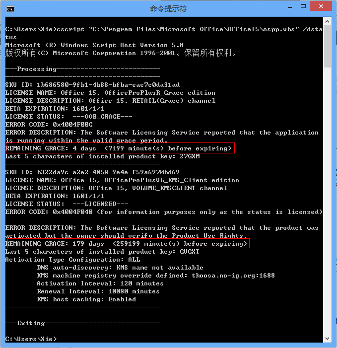 答:当你使用了脚本转换Microsoft Office 2013的Vol和Retail有可能会出现一台机器上有多个密钥存在的情况,那么使用下面两个命令行来处理,如上图,我的电脑上就有两个版本的密钥存在,其中一个剩下4天一个剩下179天,那么很容易,把4天对应的那个密钥删除掉,就是180天的KMS激活了。