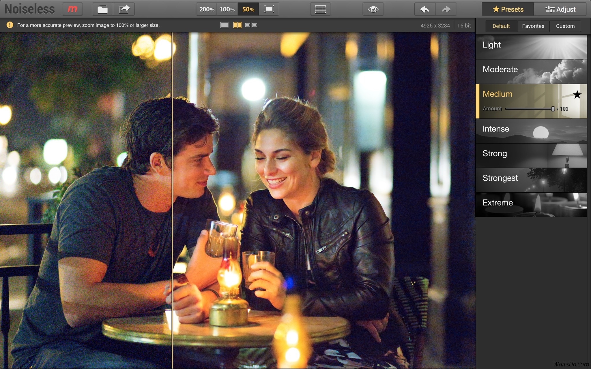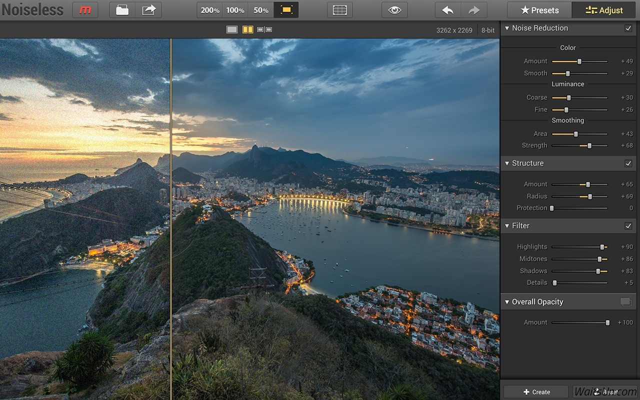 Noiseless 是一款Mac上强大易用的图片亮度调节和降噪滤镜,Noiseless提供了非常强大的图片降噪功能,除了单独运行外,还支持各种常见的图片处理软件的滤镜插件,如Photoshop、Lightroom等,并且集成了iPhoto, Aperture等软件!