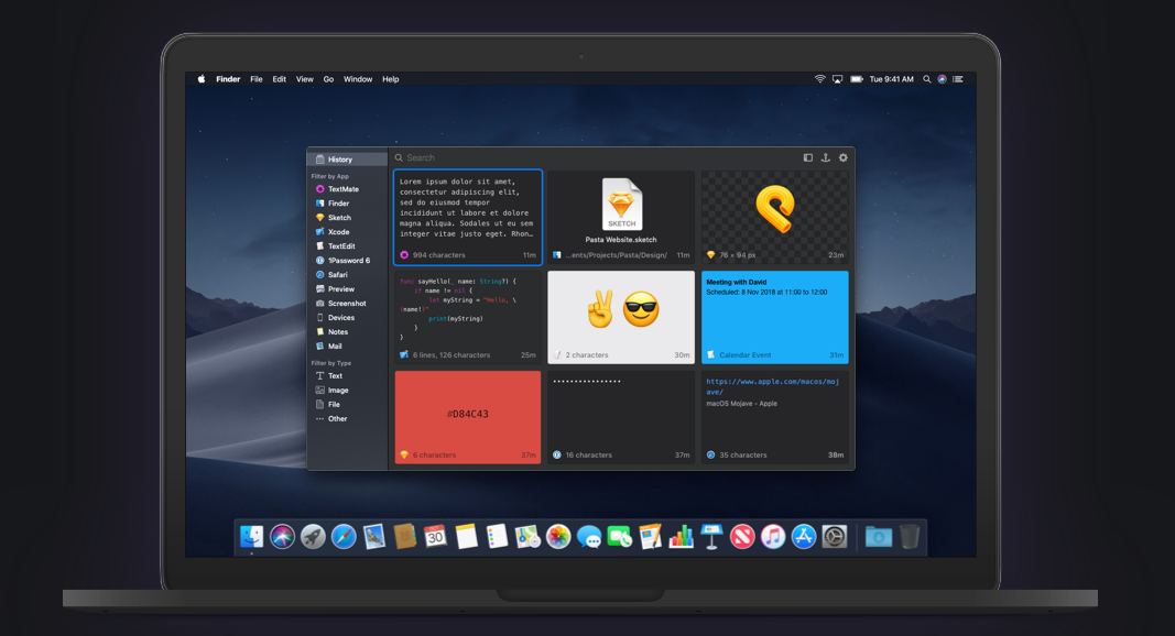 Pasta是Mac上最灵活的剪贴板管理器,界面非常美观,支持文本、图片,可以根据来源应用分类,它还支持颜色代码高亮、日历时间、链接等等
