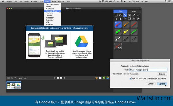 您可使用 Snagit 的各种标记工具加亮一个区域,或者将注意力吸引到某个特殊的点上。您也可通过录制屏幕和快速裁剪不需要的部分来快速创建视频。使用 Snagit 制作的所有内容都能方便地与任何人分享。
