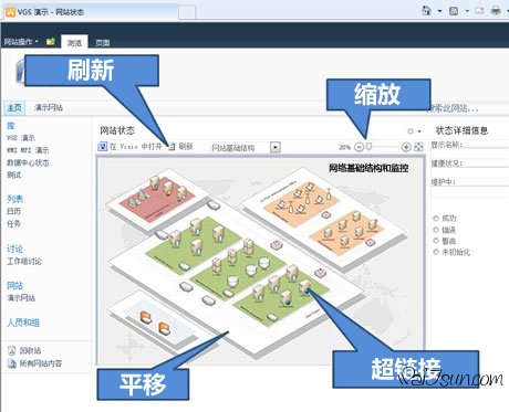 通过将图表连接到一个或多个数据源(如 Excel),只需几次单击,即可将图表发布到 SharePoint Server。联机用户可在自己的浏览器中查看图表中的高级别实时信息或深入查看详细信息,即使不具有 Visio 也可以这样做。他们可以平移和放大图表、使用形状中的超链接以及刷新数据。