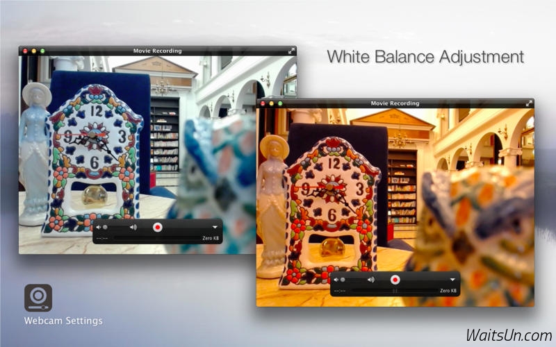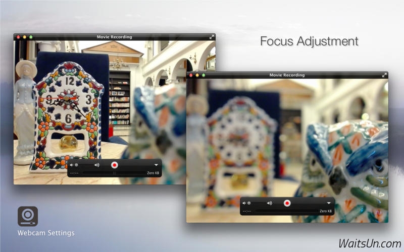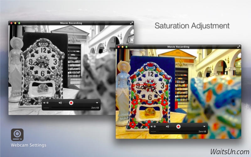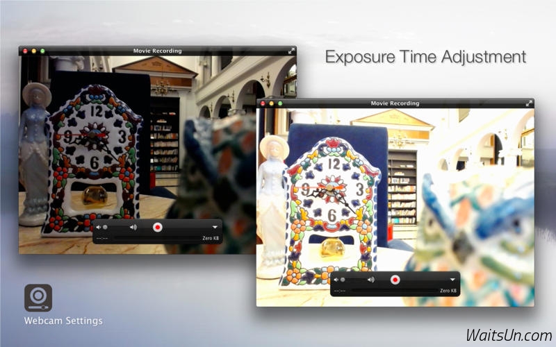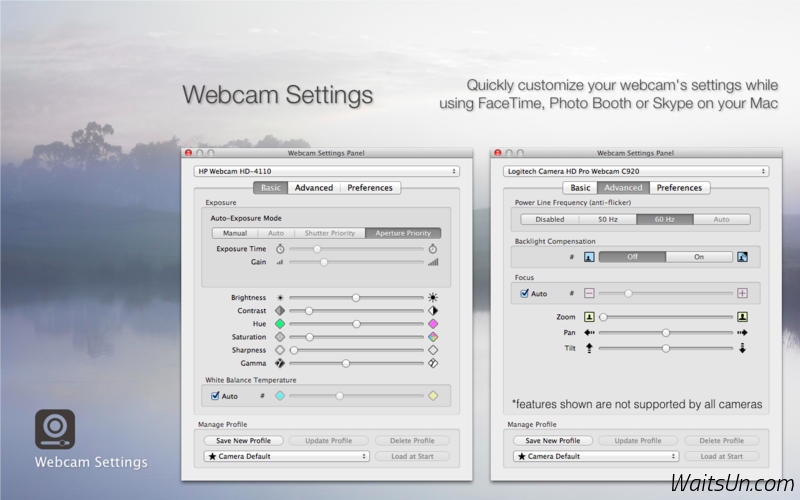 Webcam Setting 提供曝光模式/时间,亮度,对比,饱和度,白平衡色温等等丰富的的设定。除了支援Mac 内建的iSight, FaceTime/FaceTime HD 摄影机之外,也支援外接的USB 网路摄影机。
